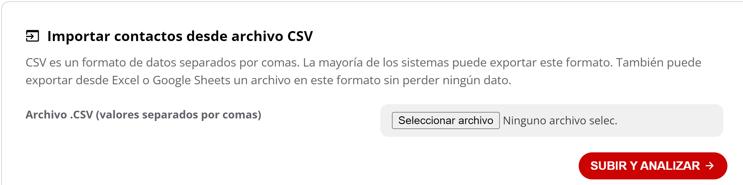 En la aplicación de contactos, sube el archivo que guardaste en formato CSV. Haz click en el botón SUBIR Y ANALIZAR: