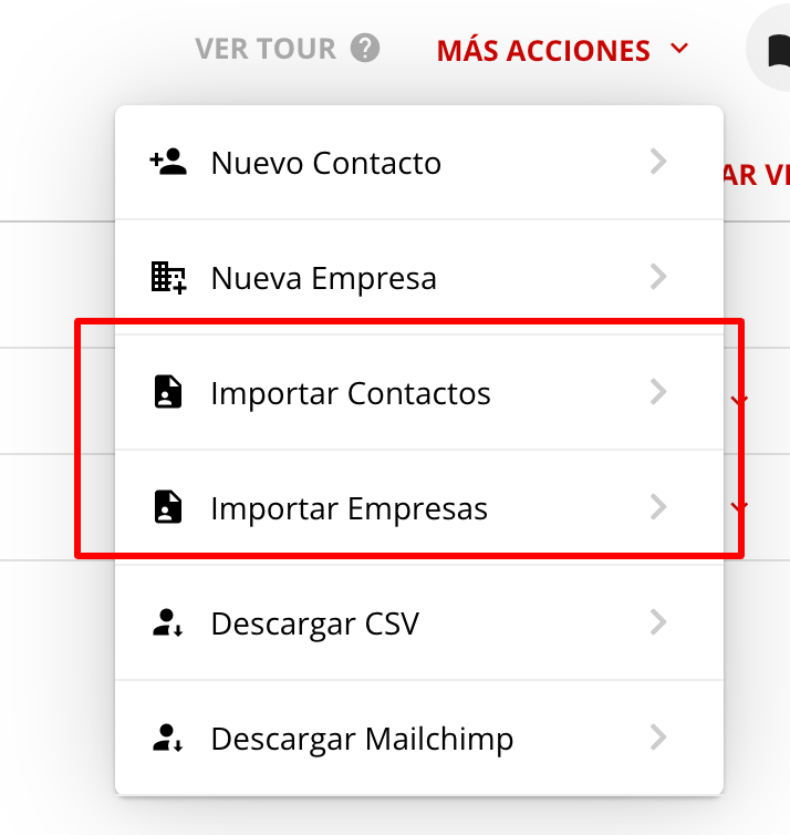 Una vez abierta la aplicación, en el Menú de acciones de lista, ubicado en la parte superior, selecciona si quieres importar contactos tipo personas o empresas: