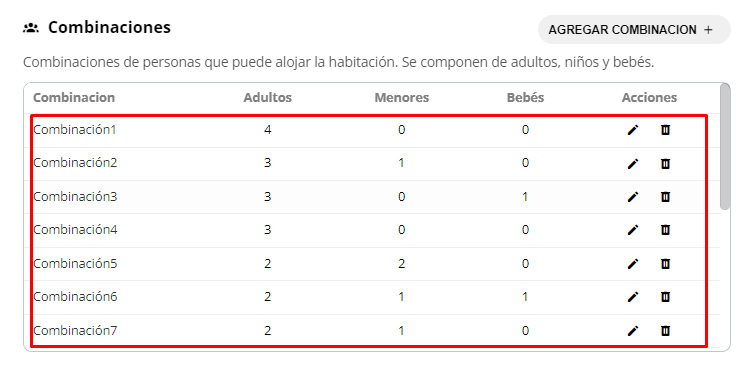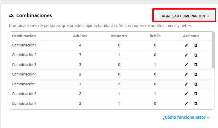 Dentro de la configuración de la habitación, haz clic en AGREGAR COMBINACIÓN.