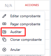 3- Una vez dentro del proveedor, haz clic en el menú de Acciones a la derecha del movimiento que has revisado y selecciona Auditar.