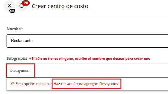 Crear subgrupos para el centro de costos. Para crear un nuevo subgrupo, escribir el nombre del mismo y luego hacer click en el mensaje que se despliega abajo del campo “Haz click aquí para agregar:”