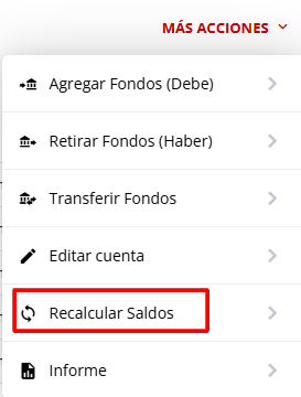 Si observas una discrepancia entre el saldo correspondiente y los movimientos realizados, utiliza la acción Recalcular Saldos.
