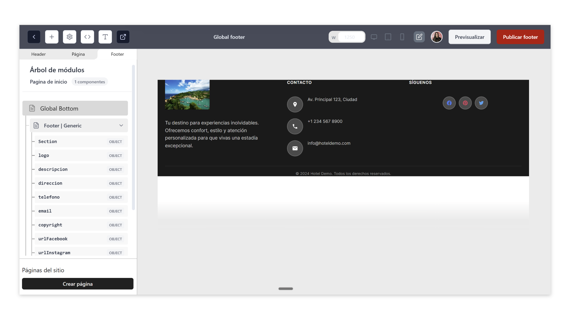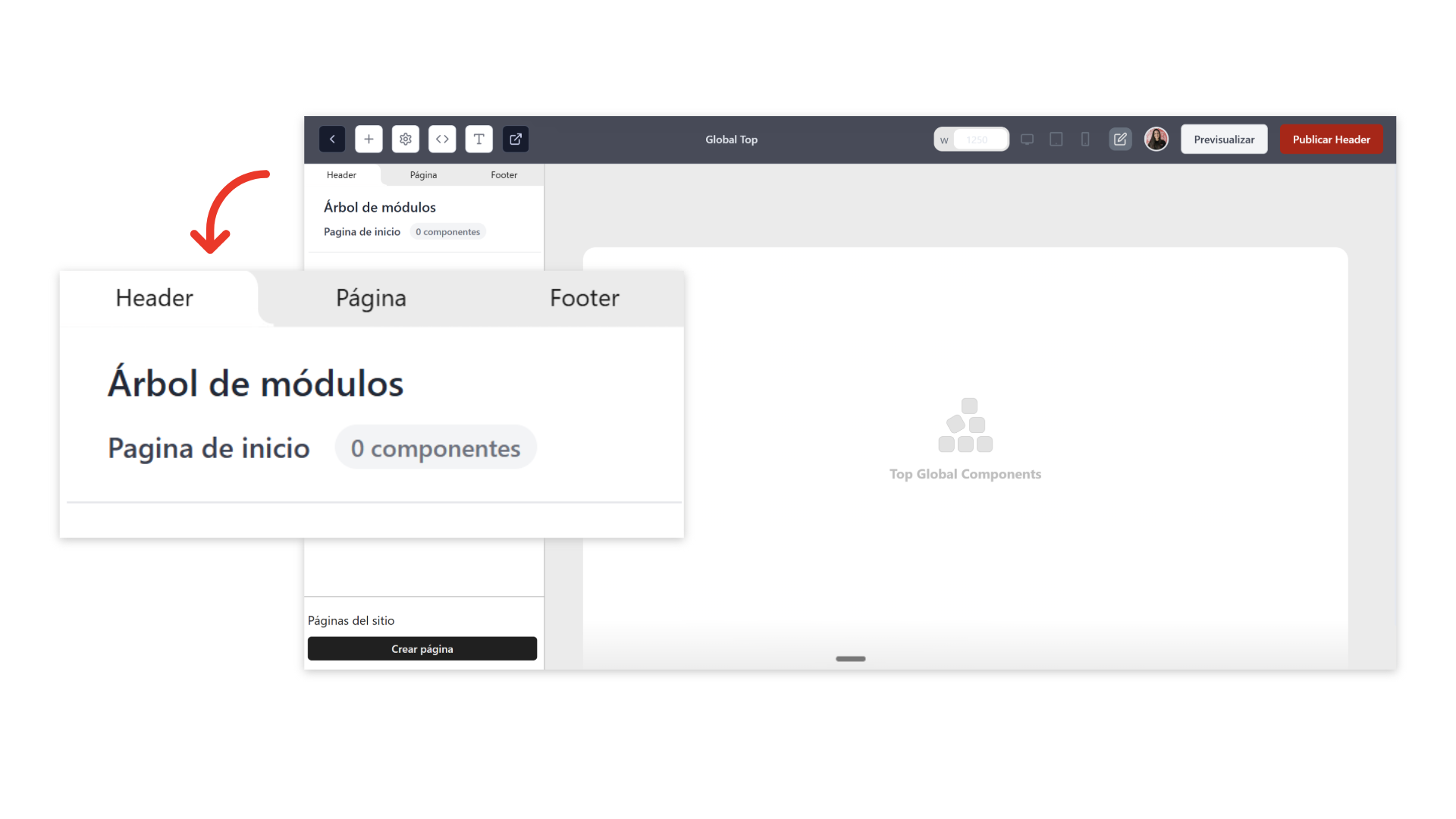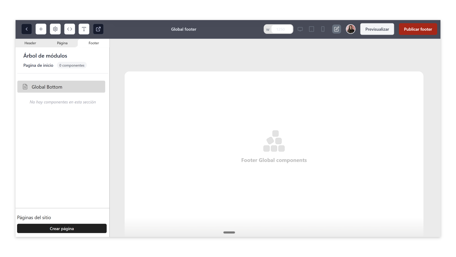 Haz clic en la pestaña “Footer” para acceder al área de componentes globales inferiores.