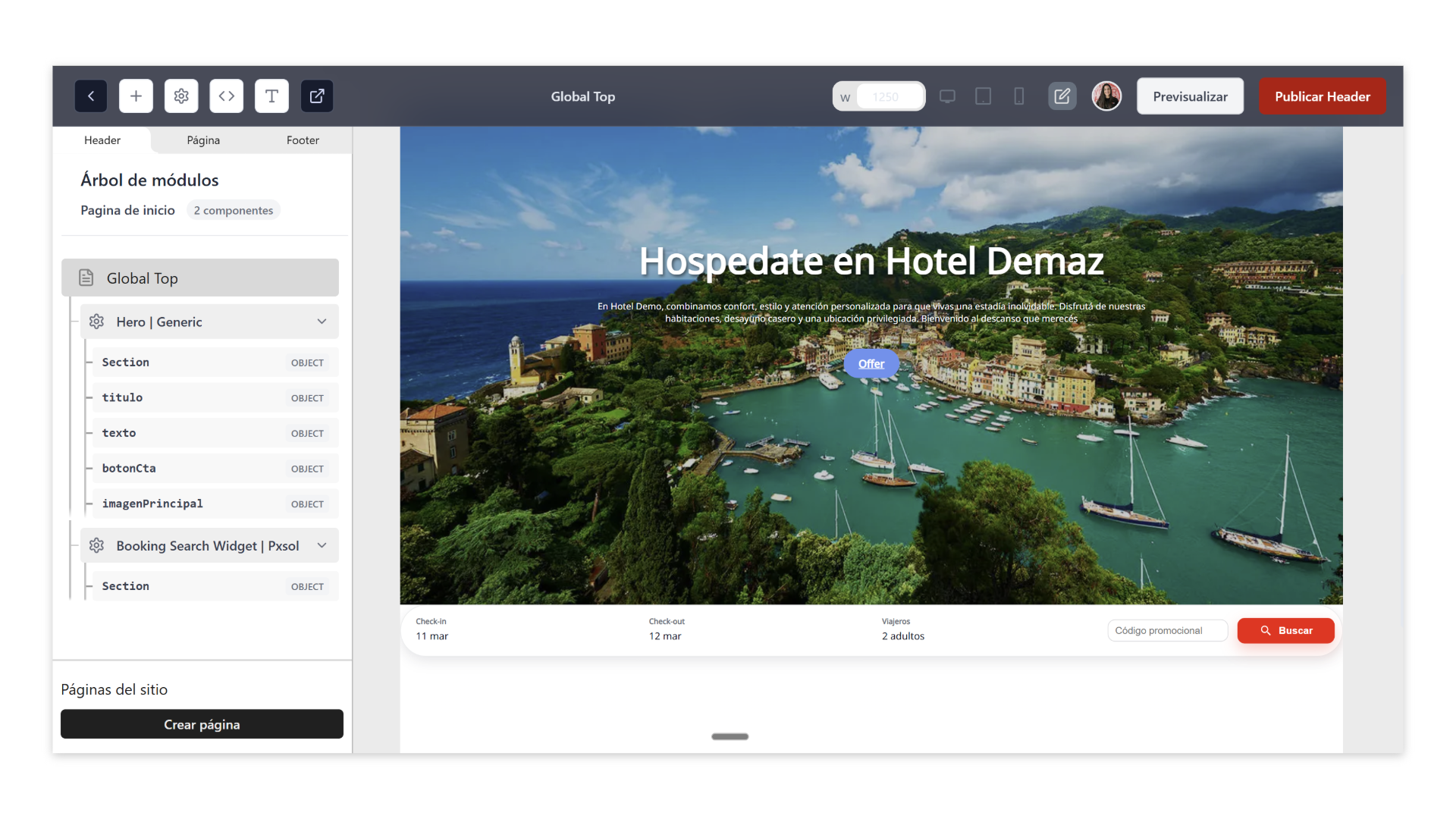 Asegúrate de estar en la sección Header para visualizar los módulos correctos.