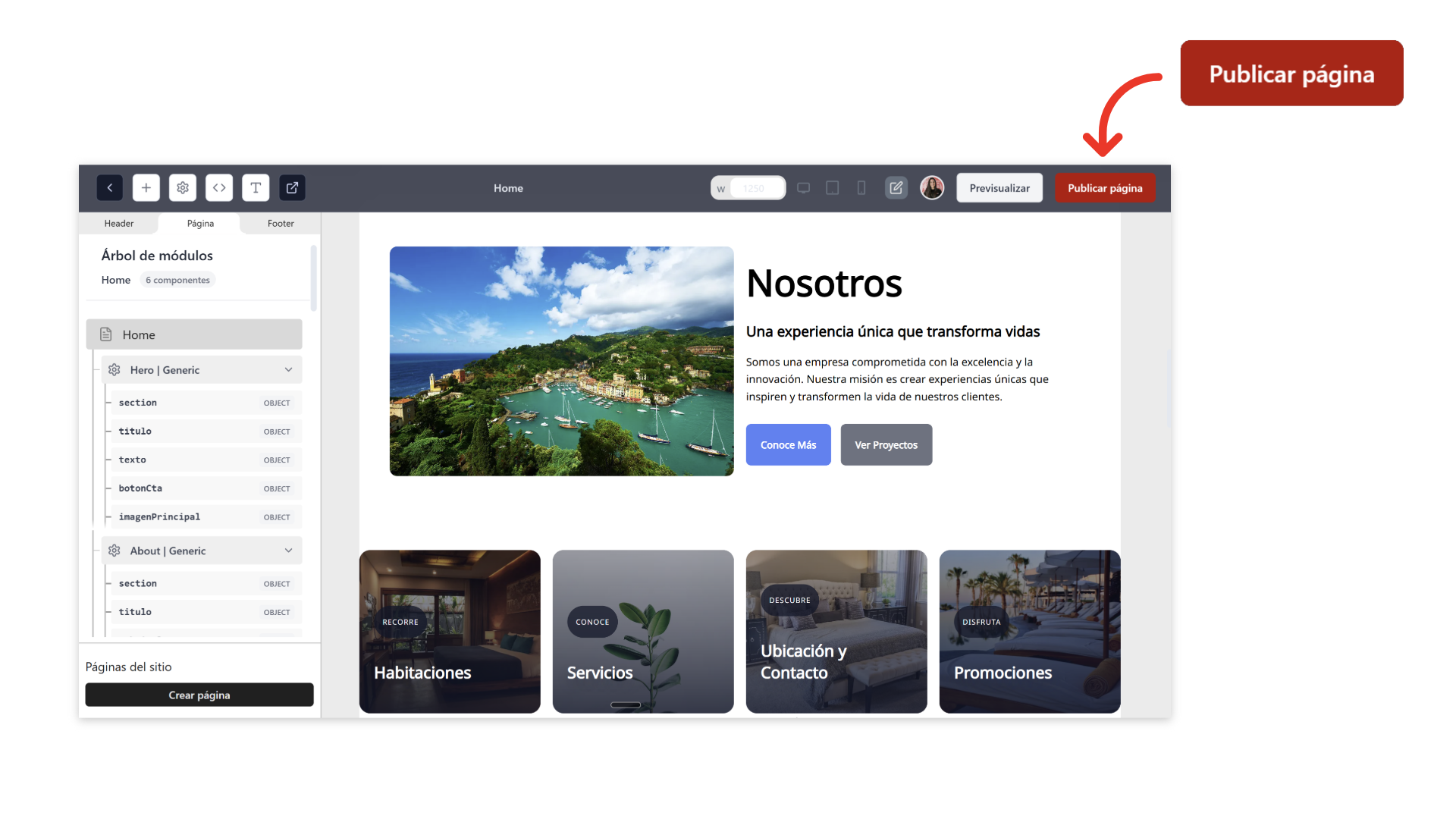 - Luego presiona “Publicar página” para que los cambios sean visibles en el sitio público.