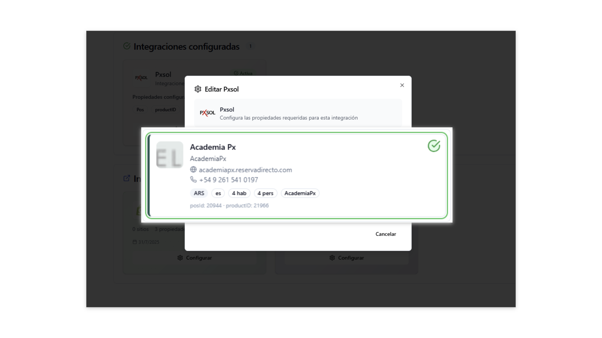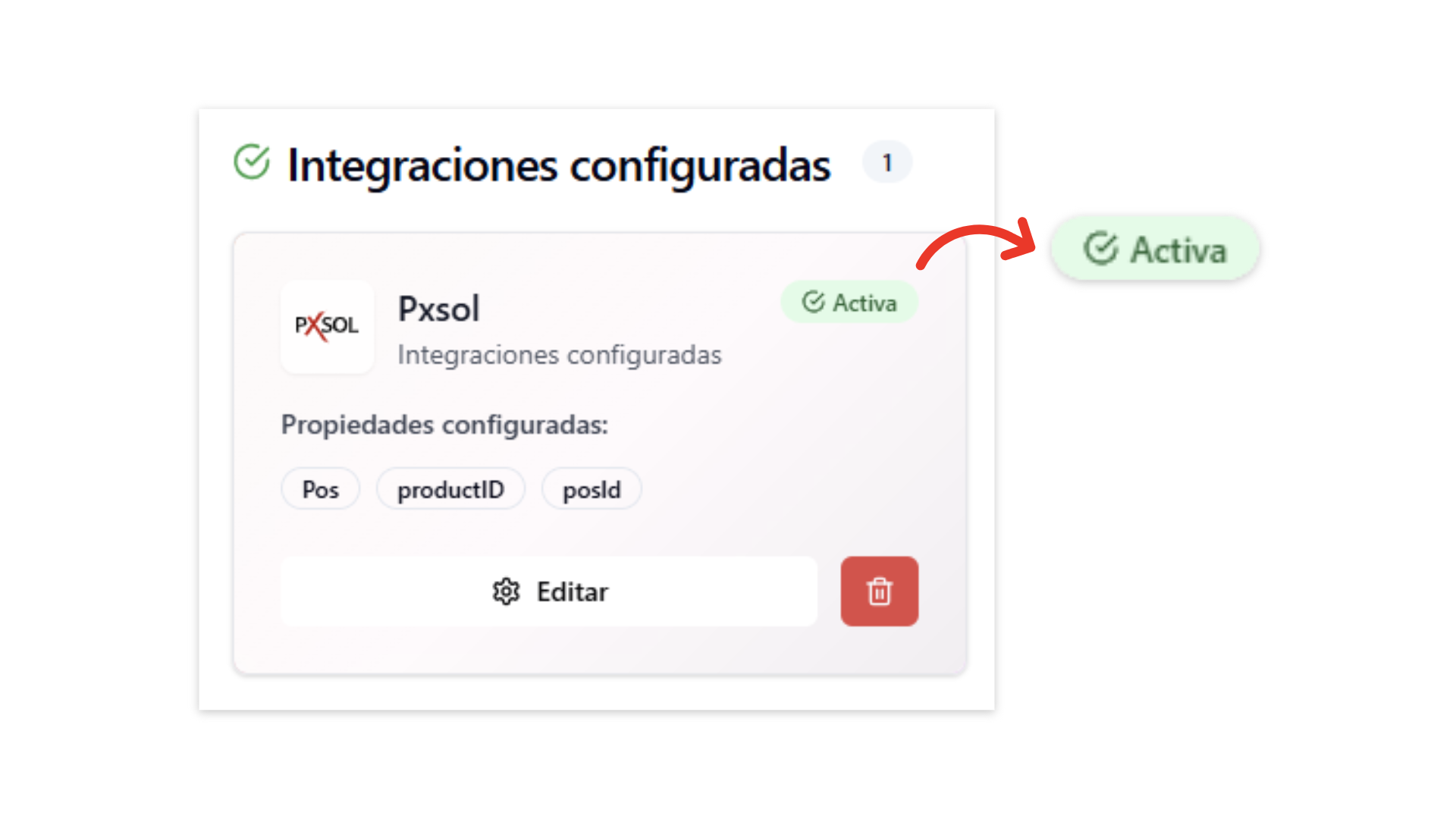 Una vez confirmada, la integración aparecerá en la sección “Integraciones configuradas” con estado “Activa”.
