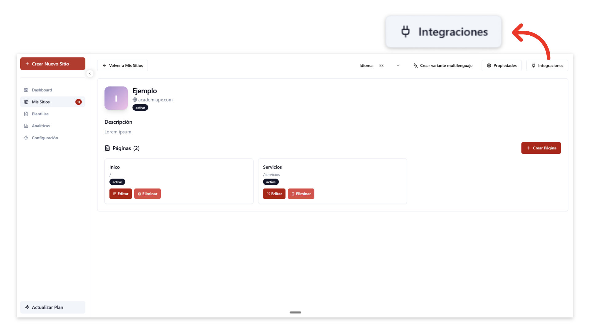 Dentro del panel del sitio, haz clic en el botón “Integraciones”, ubicado en la esquina superior derecha.