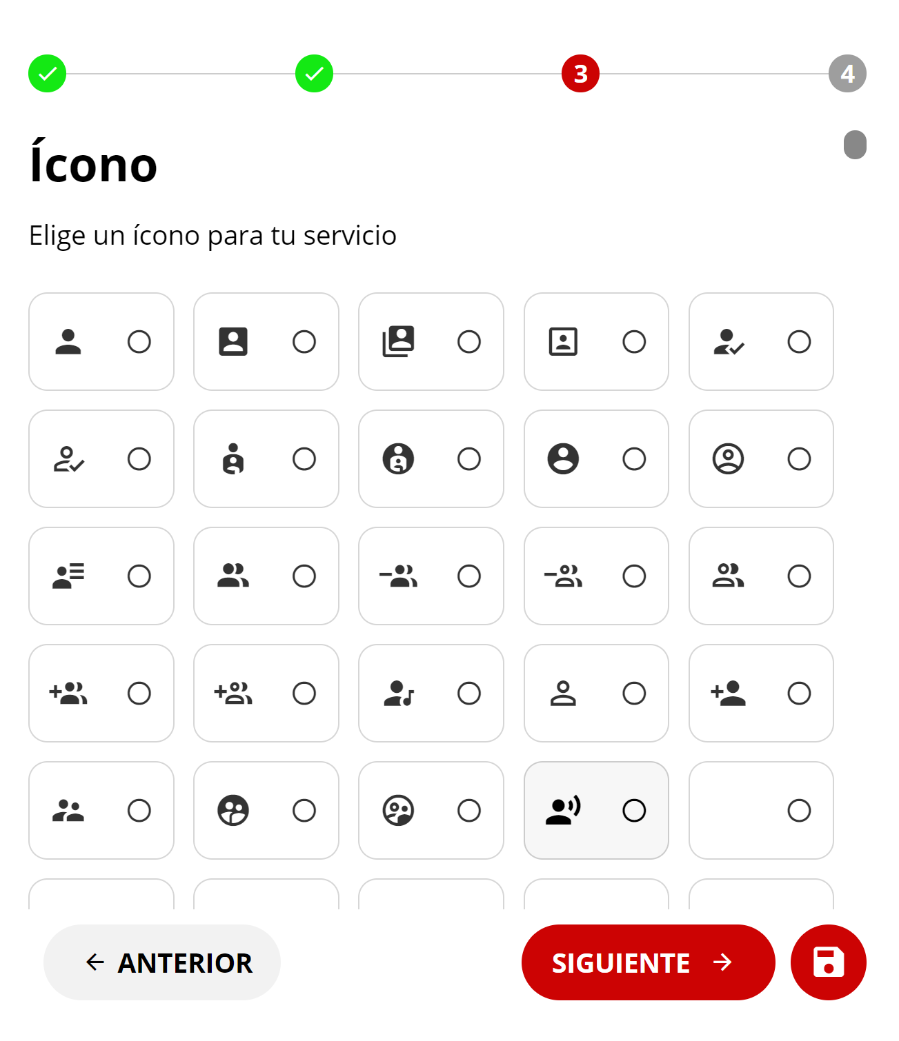 Si eligió “Otros”, se mostrará una pantalla con íconos. Seleccione el deseado y haga clic en SIGUIENTE.