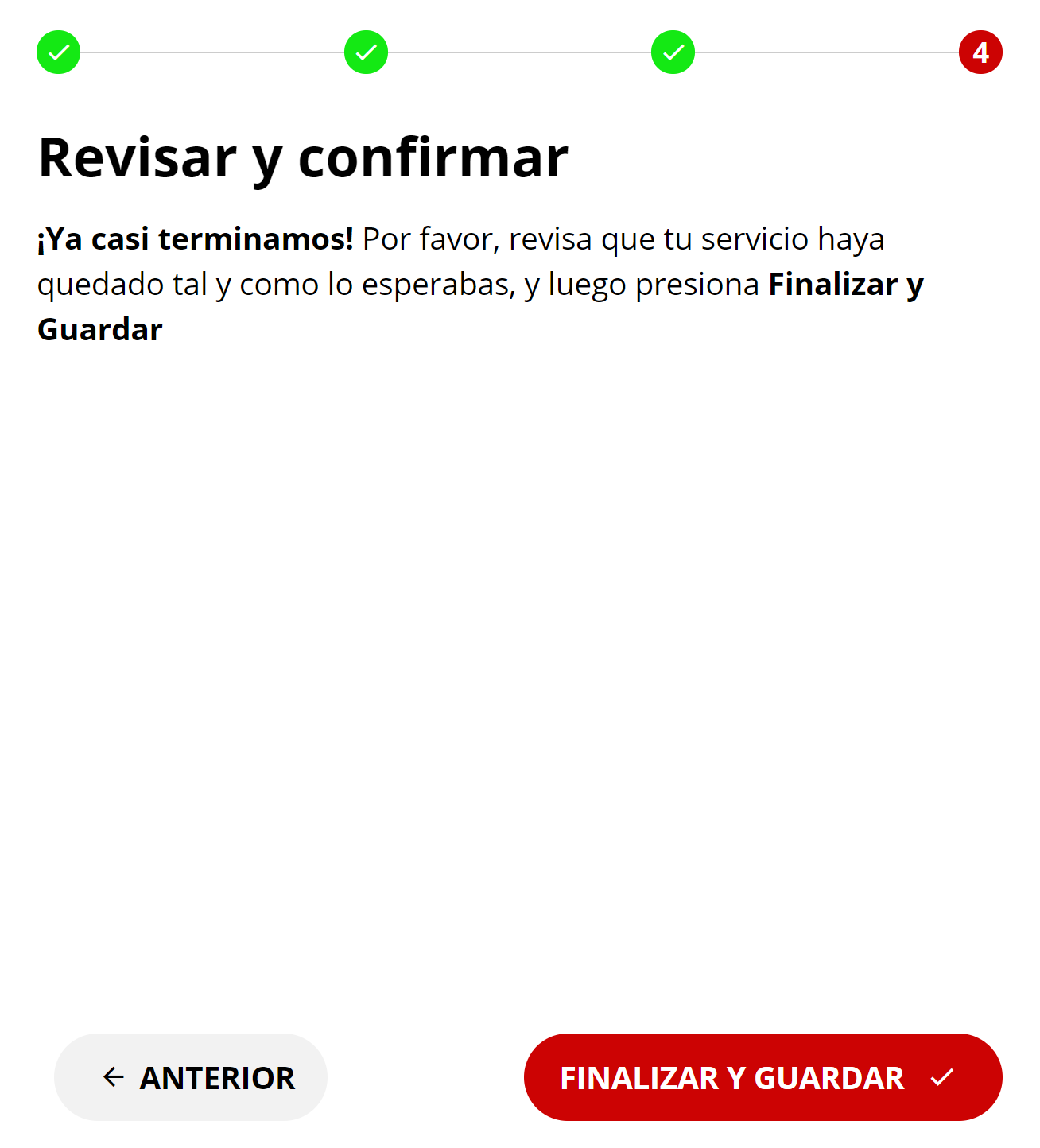 Verifique la información en la previsualización. Haga clic en FINALIZAR Y GUARDAR. Para realizar modificaciones, use el botón ANTERIOR.